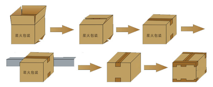 第三步:完成一字型封箱后,轉(zhuǎn)入角邊封箱機,進行四角邊封箱;